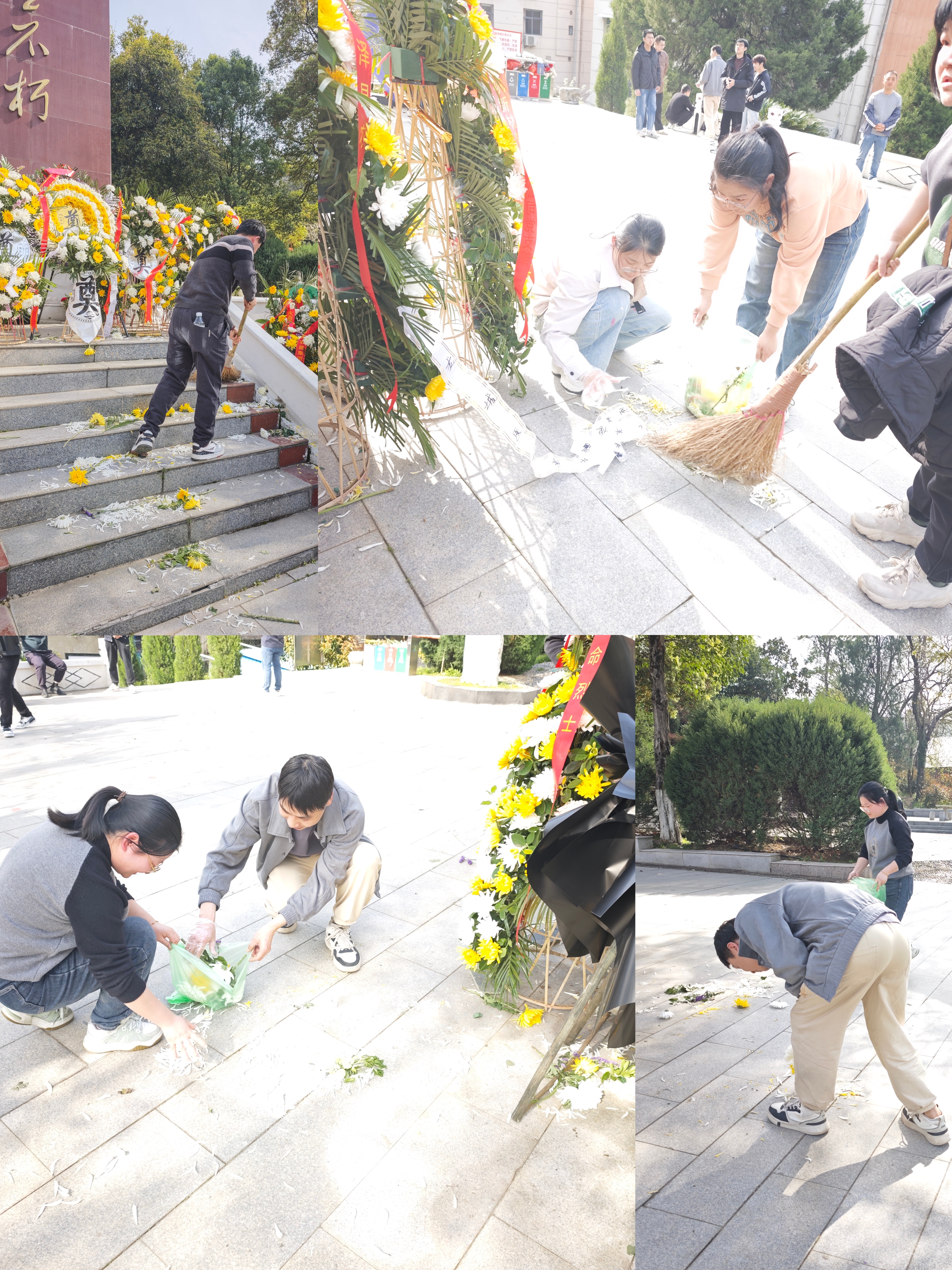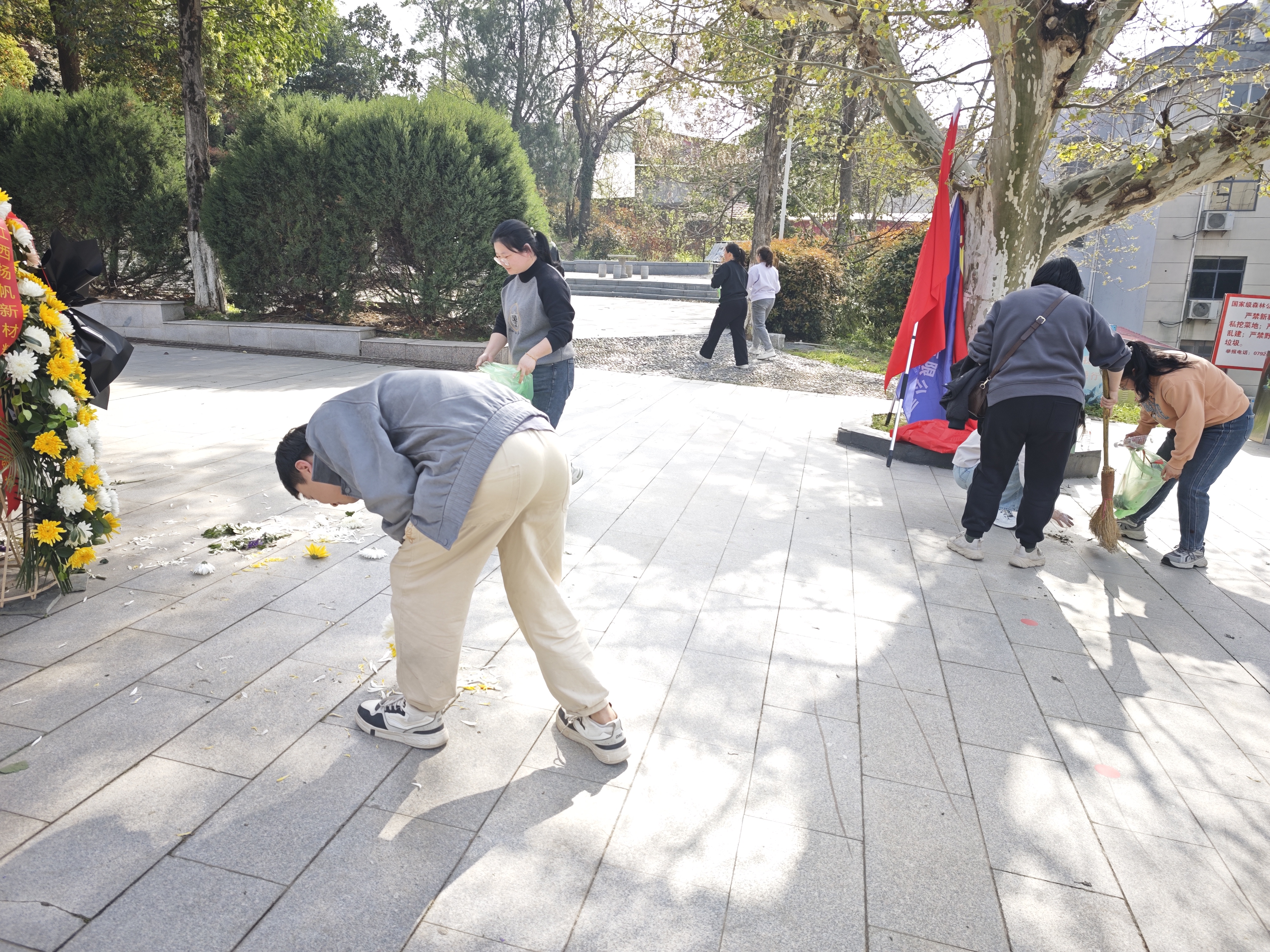 祭掃儀式結束后,大家化身“志愿守護者”,在陵園內開展義務清掃活動。大家手持掃把、垃圾袋,仔細清理陵園內的落花、枯葉、煙頭等雜物,以實際行動維護烈士陵園的整潔與莊嚴。經過大家的勞動,陵園環境煥然一新,所有人用汗水詮釋了對革命精神的傳承與踐行。